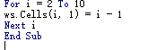 6、接著使用for循環語句來簡寫了序列號,這里是個小技巧,大家可以在不斷的練習中學會這樣使用循環來優化代碼的方法。簡單的說,就是順序選擇了a列2-10行的單元格并將其賦值為1-10。