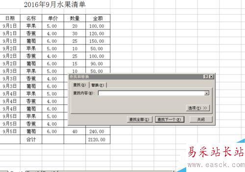 3、我們在查找的內容輸入需要插入空行的前一行B列單元格內容,如例題中,我們要求在蘋果的后面插入空行,我們就在查找的內容框里輸入蘋果。