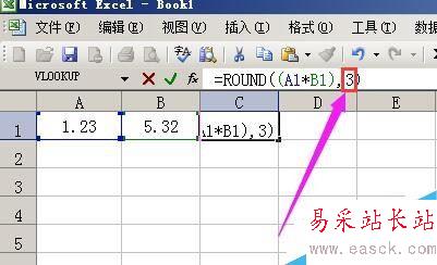 在C1單元格中輸入:=ROUND((A1*B1),3)然后按回車鍵。