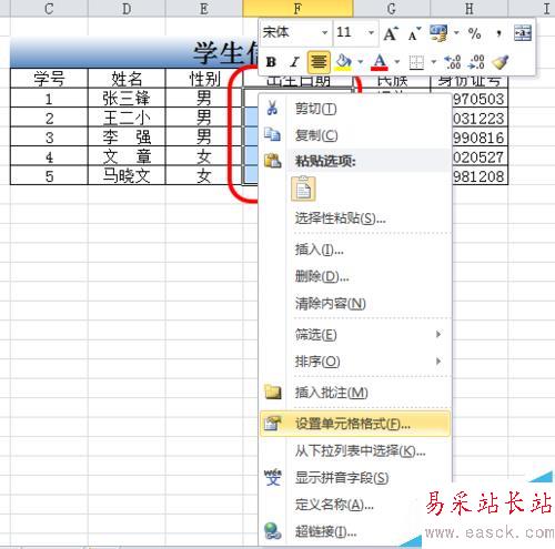 5、然后鼠標指向已選中的日期單元格,單擊鼠標右鍵-〉“設置單元格格式”: