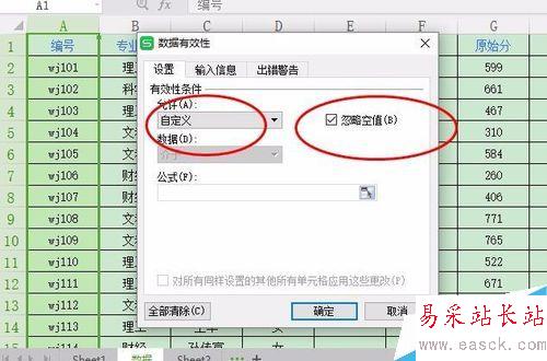 3、將設置中“允許”更換為“自定義”,勾選“忽略空值”。