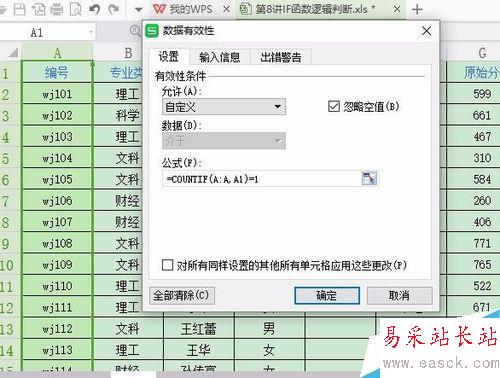 4、在“公式”區域中輸入 =countif(A:A,A1)=1 ,就可以限制A列不重復。
