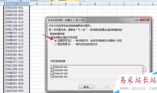 第一步:在彈出的對話框中,根據你要分列的內容選擇-分隔符號或者固定寬度,點擊下一步