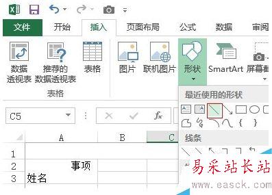 4、點(diǎn)擊工具欄的<插入>,點(diǎn)擊【形狀】,選擇直線,然后將直線按對(duì)角拉出一條線。