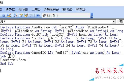 3、雙擊“模塊1”,右邊會出現編寫程序代碼的空白區域。我們聲明4個函數,編寫一句程序。FindWindow是找正在活動的窗口,GetDC是找畫布,Arc是畫圓,CancelDC是釋放畫布。一句程序就是顯示窗體。