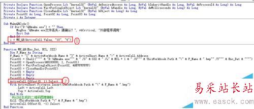 6、將工具中VBA文本文檔的代碼復(fù)制,粘貼到當(dāng)前窗口。圖中第一處標(biāo)記:i = MK_QR(ActiveCell.Value,"10", "4"),括號內(nèi)有三個參數(shù):ActiveCell.Value即是要轉(zhuǎn)換成二維碼的內(nèi)容,本例時當(dāng)前選中單元格內(nèi)容。"10",二維碼的顯示精度,顯示精度越高辨識度越高,但讀取時間較長。"4",二維碼尺寸圖中第二處標(biāo)記:ActiveCell.Offset(0, 1).Select,將生成的二維碼放置的位置,樣本代碼中