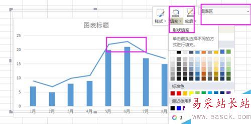 4、現在這個折線圖是覆蓋在柱形圖上面的,我們只需要將折線圖的背景色和柱狀線以及各種除折線之外的所有都進行不顯示處理,如下圖操作。