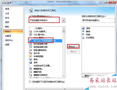 2、進入自定義快速訪問工具欄后選擇“不在功能區(qū)中的命令”然后點擊“按Enter開始朗讀單元格”,將其添加到快速訪問工具欄。