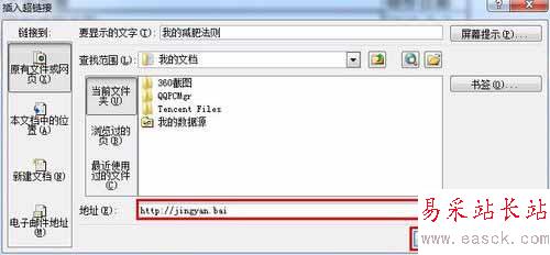 3、在上圖中紅色框框所標注的地址欄輸入超級鏈接網(wǎng)站地址或者文檔(分區(qū))名稱及完整路徑,鼠標左鍵單擊確定,超級鏈接就插入成功啦!已經(jīng)插入超鏈接的單元格文字會自動變成藍色,單擊進入超鏈接以后會變成紫色。