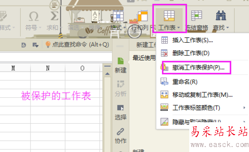 5、選中的工作表進行保護之后,在去看“工作表”的選項,你會發現顯示的是“取消工作表保護”而默認顯示是“工作表保護”,這就證明本工作表是被保護的。