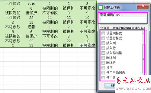 3、點擊保護工作表之后,可以看到有一些密碼,和可以修改的選項。如果對于可修改的選項不進行勾選,則是證明需要密碼才能對表單進行修改。