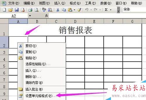 打開工作表,在工作表的“銷售報表”的A2單元格,光標點下,然后鼠標右鍵點下,彈出菜單,點擊“設置單元格格式”