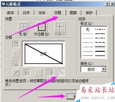 彈出設置單元格格式的操作框。在框內,點下“邊框”,然后在下圖箭頭所指的位置,點選斜線,設置好后,點“確定”。