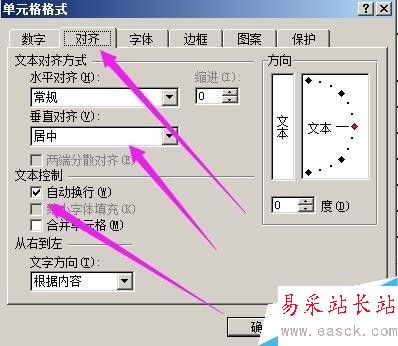 2、彈出設置單元格格式的操作框,在框內點“對齊”,然后在“垂直對齊”這里,點選“居中”;再在“文本控制”這里的“自動換行”打上勾。弄好后,點“確定”。