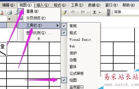 我們在工作表的上方順序點:視圖--工具欄,然后再在“繪圖”這里打勾。