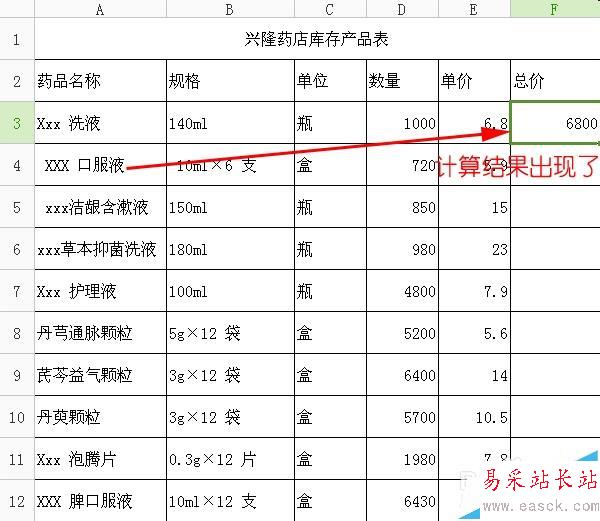 使用excel中的公式對數(shù)據(jù)進行運算,可以大大的提高工作效率。這一篇簡單的介紹乘法公式的運用。下面是一張興隆藥店庫存藥品表,每一種藥品都有單價和數(shù)量。現(xiàn)在我們想知道每一種藥品的總價和所有藥品的總價。應該怎么辦呢?