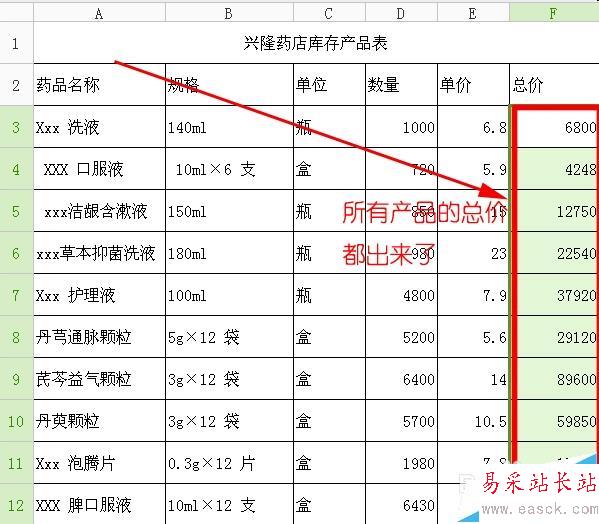 把光標一拉到底,哈哈。所有的產(chǎn)品的總價都出來了。怎么樣,比我們一個一個計算要快的多吧。