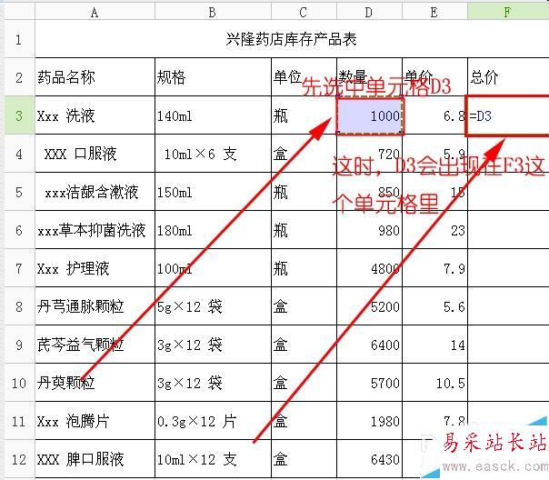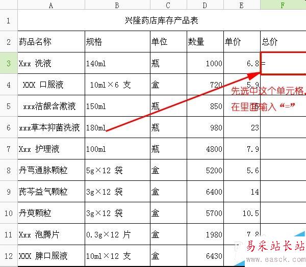 首先,我們選中第一個行,xxx洗液的總價單元格,也就是單元格f3。在里面輸入運算符“=”。
