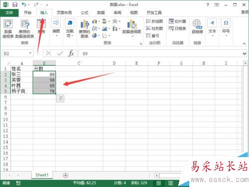 2、在Excel2013工作簿程序窗口,選擇需要編輯的單元格,并打開“插入”菜單選項卡。如圖所示;