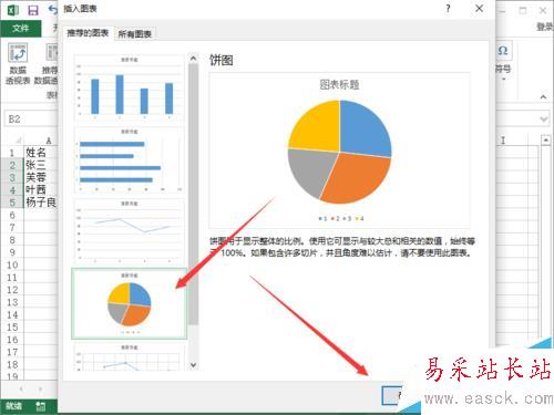 5、在“插入圖表”對話框中,選擇“餅圖”選項并點擊“確定”按鈕。如圖所示;