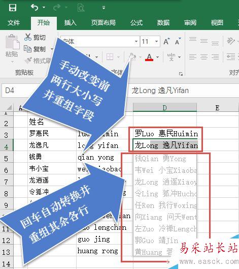 實例4:【自動抽取+變換+合并】完成姓名分別加注漢語拼音,且要求首字母均大寫。