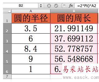 2、向下填充其他單元格,即可返回其他半徑的圓周長。
