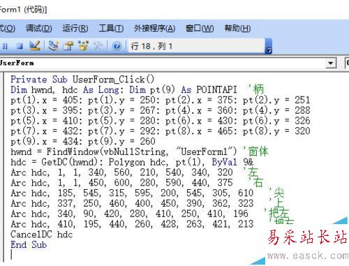 5、窗體編程。雙擊窗體進入編程界面,編寫窗體單擊事件觸發的程序,調用模塊1里聲明的5個函數、1個結構編寫程序。重點畫好6個圓、1個八邊形。