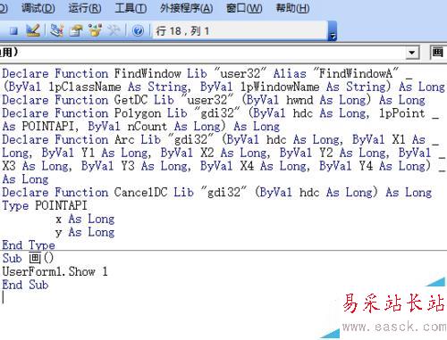 3、模塊編程。在模塊1內編程,聲明5個函數、1個結構,并編寫一句顯示窗體的程序——“畫”。