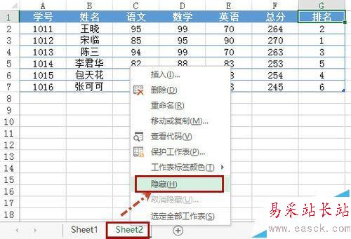9、為了避免用戶看到Sheet2工作表的成績信息,可以將其隱藏。點擊Sheet2右擊選擇“隱藏”。