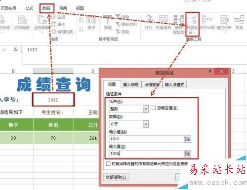 4、點擊輸入序號的那個單元格,然后點擊“數據”選項卡中的“數據驗證”,在打開的“數據驗證”對話框中,設置驗證條件如下圖所示。把“忽略空值”不選中,這樣可以輸入序號時候不允許輸入空值,“允許”設為“整數”,介于可以輸入學號的起止學號。