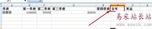 1、如圖所示,在第四季度和獎金之間插入一列,命名為全年。這是為了求得全年的銷售額
