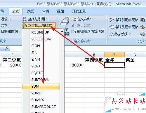 2、選中F2單元格,然后執行:公式--數學和三角函數--SUM