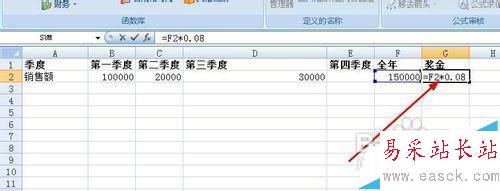 4、然后再G2單元格輸入公式:=F2*0.08 ,這里的0.08就是獎金率,也就是說銷售額的百分之八作為獎金