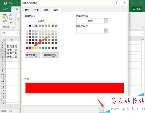 6、在“設(shè)置單元格格式”對話窗口中,選擇“填充”選項卡,并在背景色中選擇一個顏色,如:紅色。在點擊確定按鈕。 如圖所示;