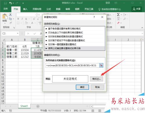 4、“新建格式規(guī)則”對話窗口中,在選擇規(guī)則類型中的選擇“使用公式確定要設(shè)置格式的單元格”,并在“為符合此公示的值設(shè)置格式”輸入框中輸入“=or(max($C$3:$C$5)=$C3,min($C$3:$C$5)=$C3)”,再點擊“格式”按鈕。如圖所示;