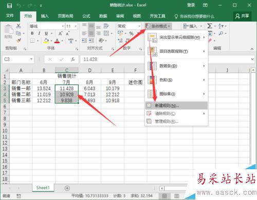 2、在打開的Excel工作薄窗口中,選中C3:C5單元格,并在開始菜單選項卡中,點擊樣式功能區(qū)的“條件格式”命令選項,在彈出的選項框中點擊“新建規(guī)則”選項。如圖所示;