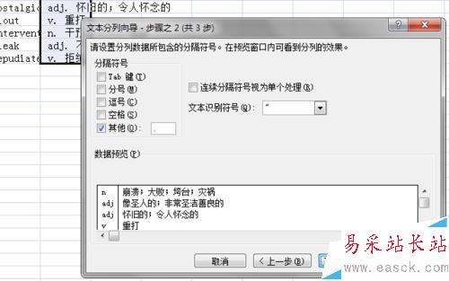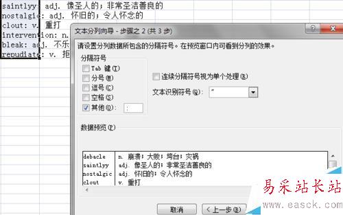 4、在接下來的步驟中,選中“其他”,然后在“其他”后面的文本框中輸入一個英文的冒號。點擊“下一步”。