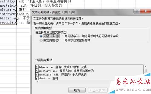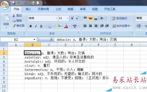 1、如圖,在 Excel 打開的工作表中,有一列單詞及其詞性、釋義的列,單詞后跟一個英文的冒號,詞性后跟英文句點。現(xiàn)在,需要將單詞及其詞性和釋義進行分割,并分別放置到單獨的列中。