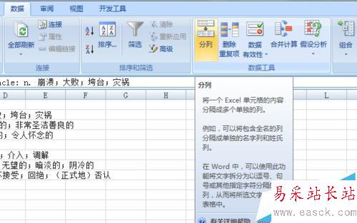 2、選中上述列,然后依次點擊“數(shù)據(jù)”選項卡——“數(shù)據(jù)工具”組——“分列”按鈕。單擊后將會彈出“文本分列向?qū)?rdquo;。