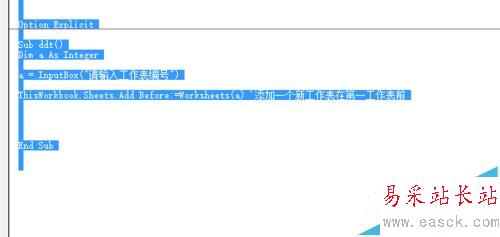 3、寫這段代碼的時候我們需要理解add這個命令的作用,在sheets對象中,add命令就是增加一個新的sheets(工作表),這里用一個空格befor:=來表示是在該表格之前。