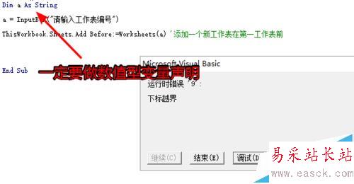 5、如果寫具體的工作表名稱是能夠達到準確的目的,但是為了靈活性,我們還是建議選擇序列方式新建工作表更加的容易一些。所以這里我們使用了inputbox函數通過輸入來獲取工作表的序列。