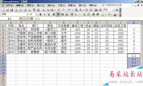 2、在剛輸入的數字下面向下輸入1.1,2.1……,比上面的數據少一行,本列在K9中輸入1.1
