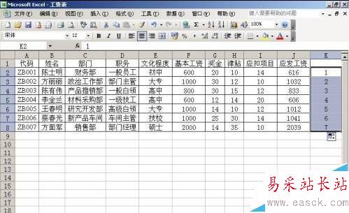 1、打開工資表→在工資表最后一空白列輸入1,2,3。