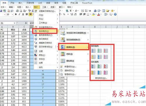 3、鼠標直接放在“條件格式”選項上會出現下一級選項框,選擇“數據條”,對格式條進行設置。