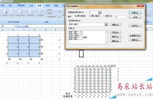 2、我們需要像圖中一樣建立個(gè)3×3的表格,并設(shè)置對行,列,對角線進(jìn)行求解。這是規(guī)劃求解中的一項(xiàng)約束條件。