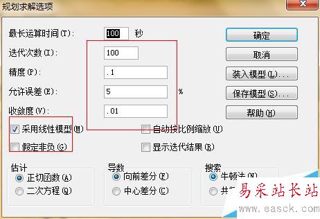 6、最后我們還要在規(guī)劃求解中的選項(xiàng)中進(jìn)行設(shè)定,選擇線性求解,將精度和收斂度調(diào)大,否則計(jì)算次數(shù)過多還會出現(xiàn)小數(shù)。設(shè)定后點(diǎn)擊求解便可以得到結(jié)果。