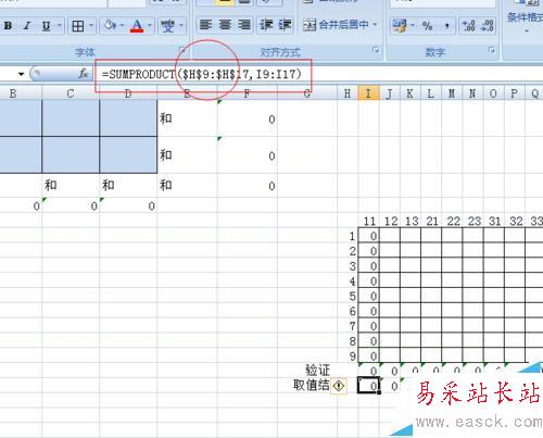 4、我們可以用sumproduct函數(shù)得到九宮格的取值結(jié)果,并將其與九宮格各個(gè)位置建立關(guān)系。可以直接在九宮格每個(gè)位置用“=”得到各個(gè)位置的取值。
