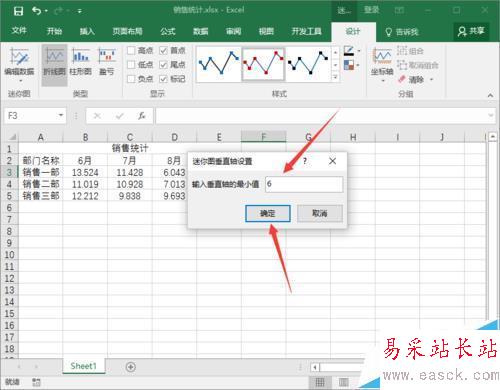 6、點擊自定義值命令選項后,這個時候會彈出一個“迷你圖垂直軸設置”對話框,在“輸入垂直軸的最小值”文本框中輸入“6”,然后單擊“確定”按鈕。如圖所示;