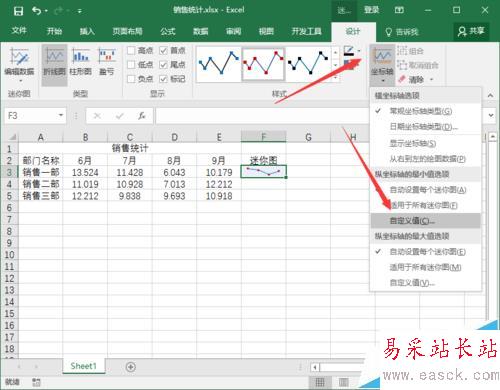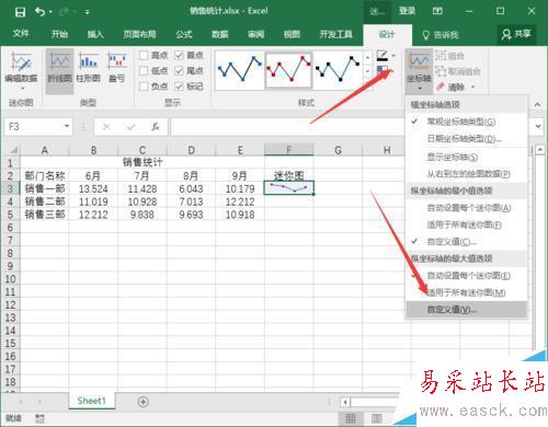 5、現在需要來修改迷你圖的坐標軸格式。接著再點擊“分組”功能區的“坐標軸”-->“縱坐標軸的最小值選項”下的“自定義值”命令選項。如圖所示;