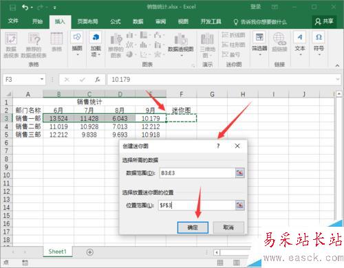 3、點擊“折線圖”按鈕選項后,這個時候會打開“創建迷你圖”對話框。在創建迷你圖對話框中,可以看到鼠標光標已經定位到了“選擇放置迷你圖的位置”區域中“位置范圍”內,我們選中F3單元格,在“位置范圍”右側的文本框中就會自動輸入“$F$3”,而后再單擊“確定”按鈕。如圖所示;